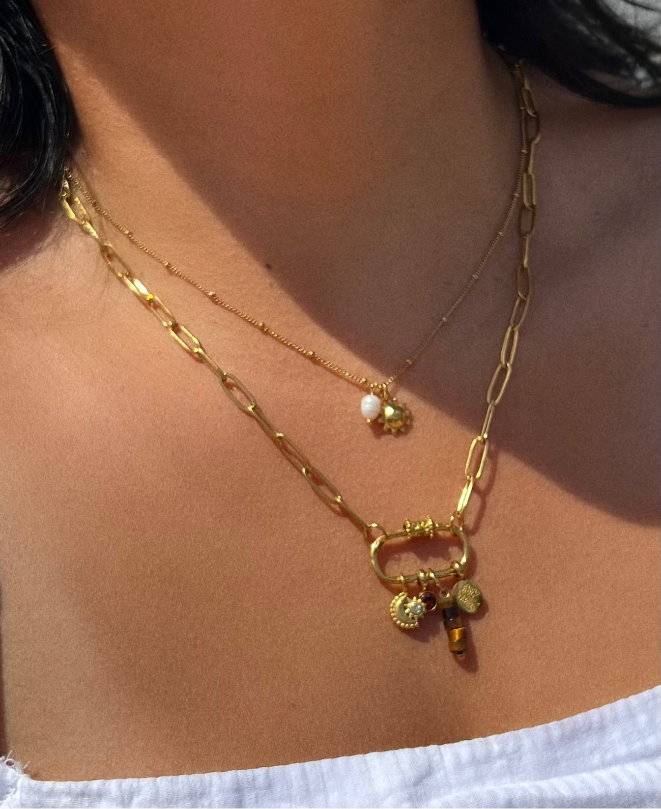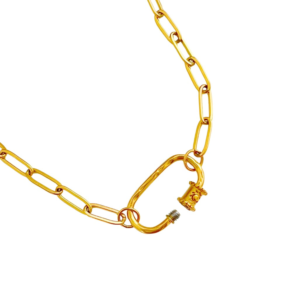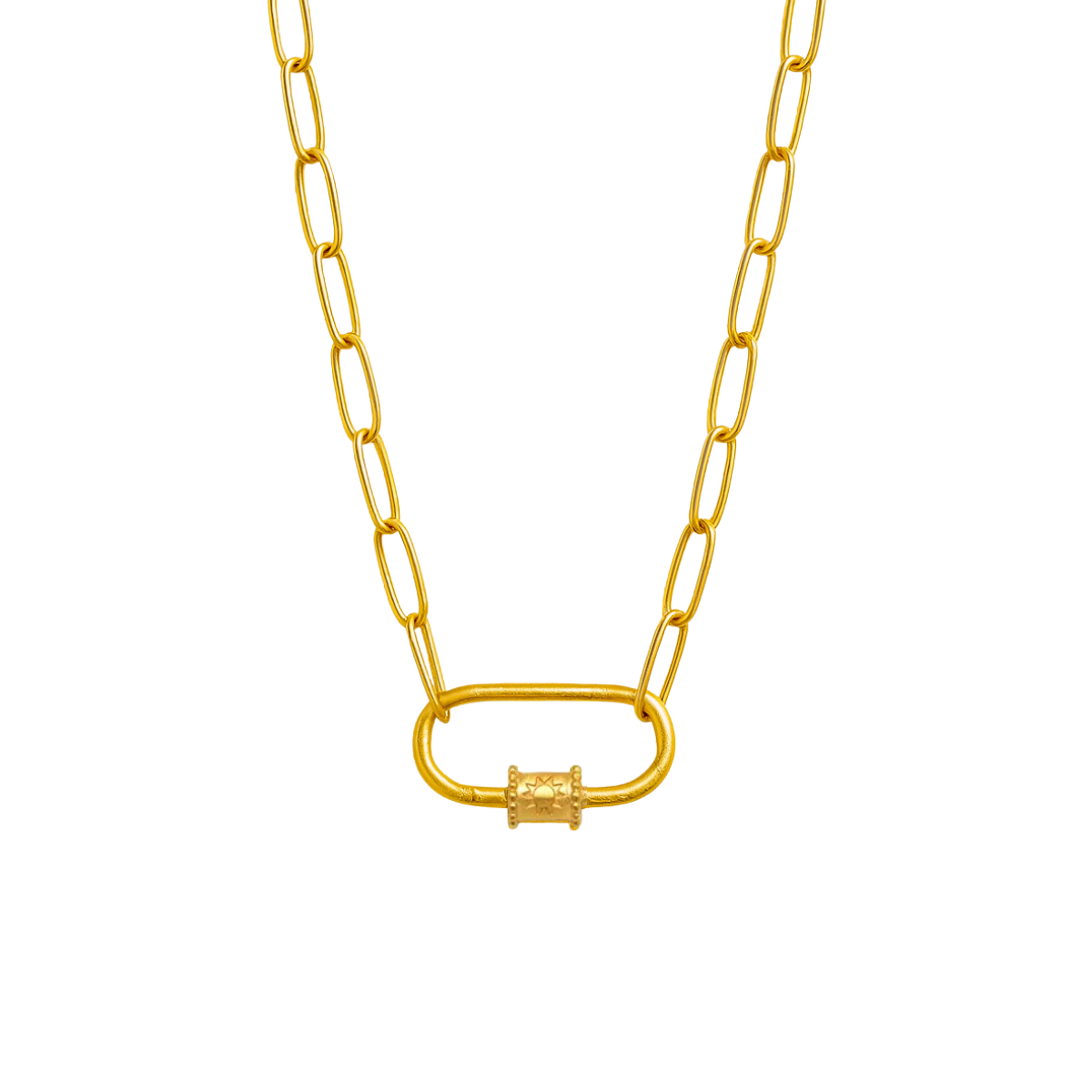 Embrace a fresh start with the New Beginnings Sun Charm Necklace. Crafted in 18k gold plated stainless steel, this unique necklace showcases a carabiner design, perfect for displaying your chosen Sacred Charms. Engraved Sun, representing new beginnings, hope, and power. Create your own personalized charm necklace with meaningful gemstones.