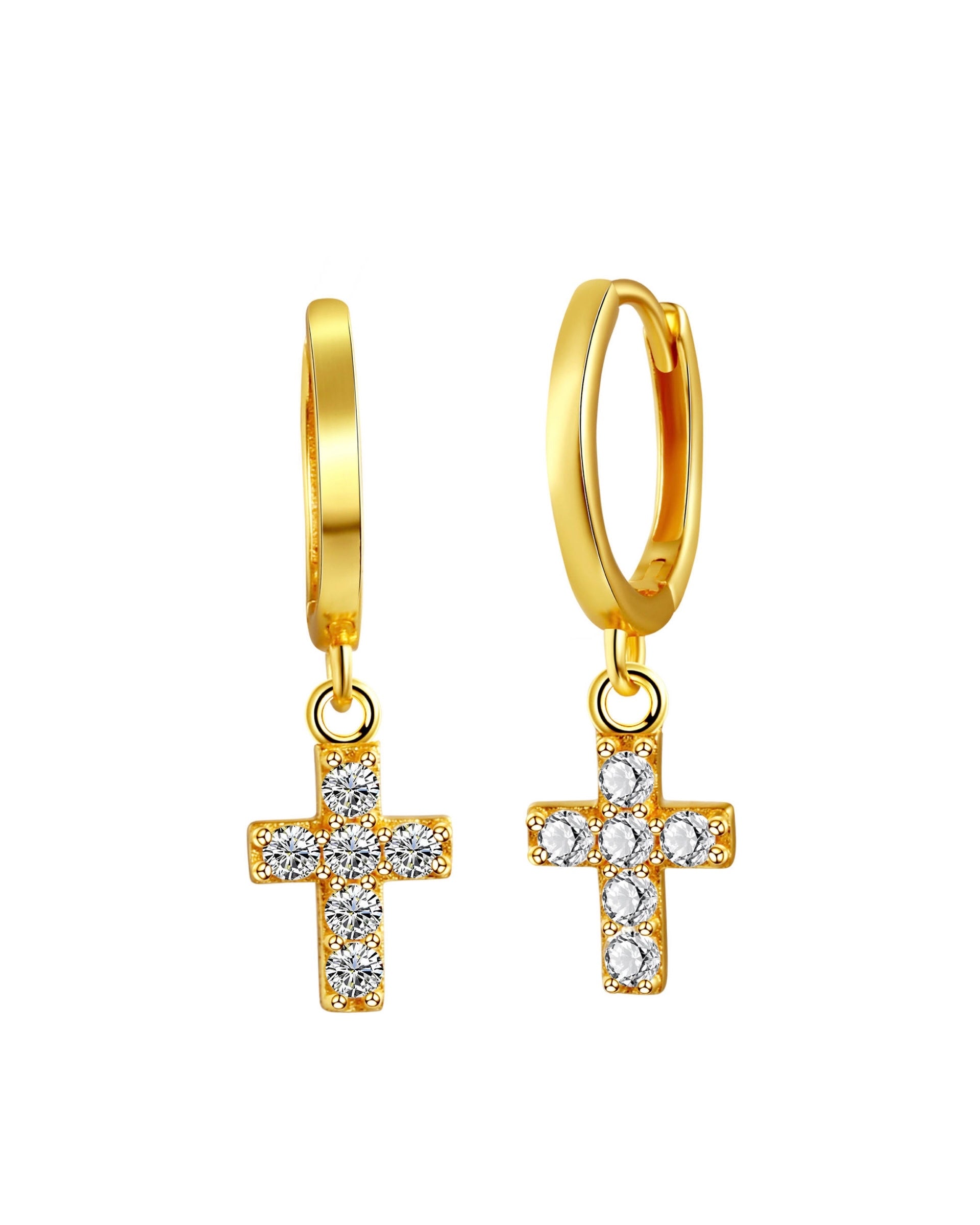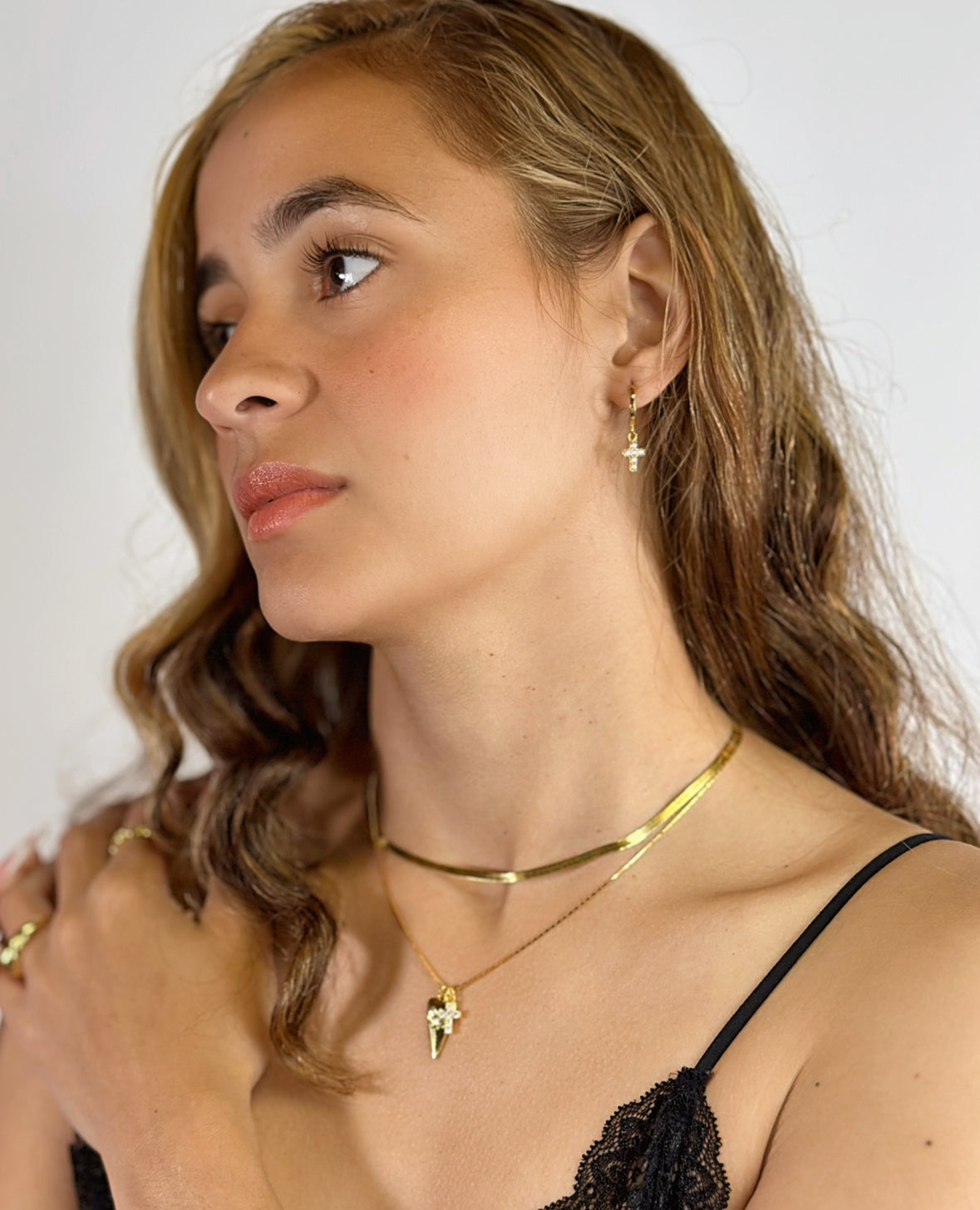 Introducing the ORA Earrings, a unique and stylish accessory. Crafted from 18k gold sterling silver and cubic zirconia stones, these earrings feature a cross-shaped dangle that adds movement and sparkle. The hinged backs ensure a secure fit, making them perfect for pairing with simple hoop earrings or studs.